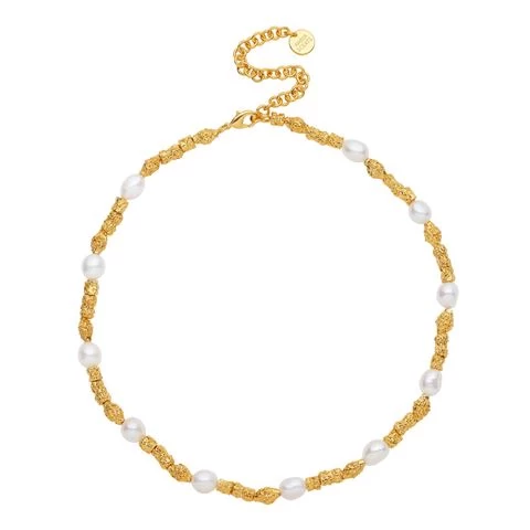The Amber Sceats Leia necklace was created to be treasured. It’s strung with organically shaped freshwater pearls separated by a trifecta of 24k gold plated textured discs. It’s positively regal. Â