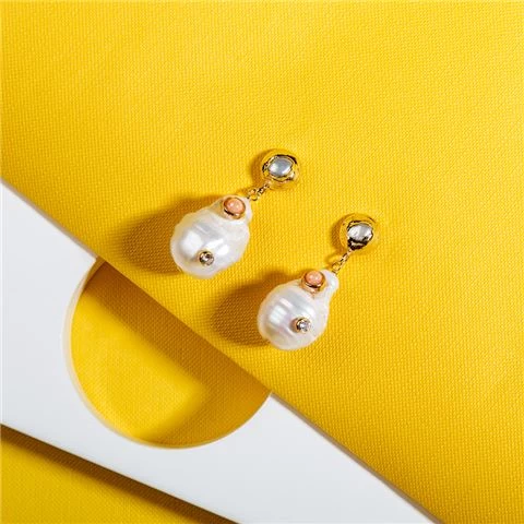 - Earring gives way to a large baroque freshwater pearl that’s embedded with clear cubic zirconias and pink gemstones.