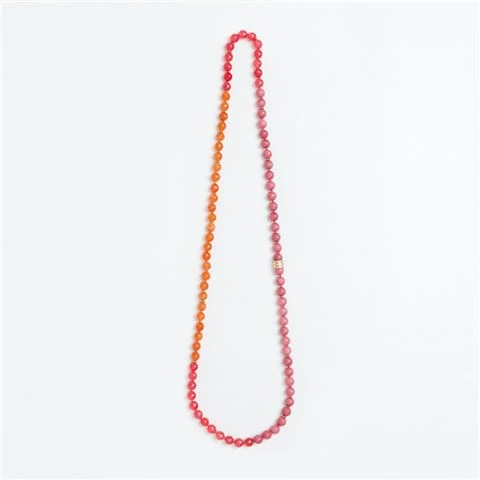 - Threaded with faceted agate gemstones of various tones including rose, camelia pink and tangerine.