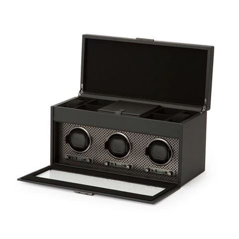 The Axis Tripe Watch Winder drives a modern, bold look for safekeeping your timepieces. It features Wolf’s patented technology of counting the precise number of rotations, with three directional settings; clockwise, counter-clockwise and bi-directional. Plus, the patented lock-in dynamic cuff ‘locks’ your timepiece into the rotator drum for a secure fit. Bold luxury, faultless design, take Axis for a spin.
